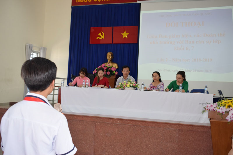 Hôm qua ngày 07/03/2019, nhằm tạo điều kiện cho học sinh nhà trường được gặp gỡ, trao đổi và nói lên những suy nghĩ, tâm tư tình cảm của học sinh đến ban giám hiệu nhà trường, Công đoàn, Chi đoàn trường đã tổ chức buổi đối thoại giữa học sinh và Ban giám hiệu, lãnh đạo Công đoàn, Chi đoàn nhà trường. Buổi đối thoại diễn ra trong không khí vui tươi - thoải mái - thẳng thắn - dân chủ giữa ban giám hiệu và các em học sinh là ban cán sự lớp đại diện cho học sinh các lớp.